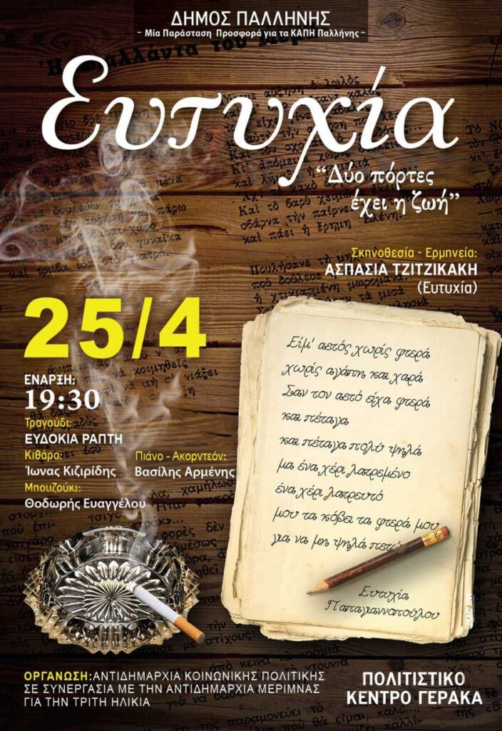 Την Πέμπτη στις 7.30μμ ο Δήμος Παλλήνης διοργανώνει το Μουσικό Αφιέρωμα ‘Ευτυχία, δυο πόρτες έχει η ζωή’.