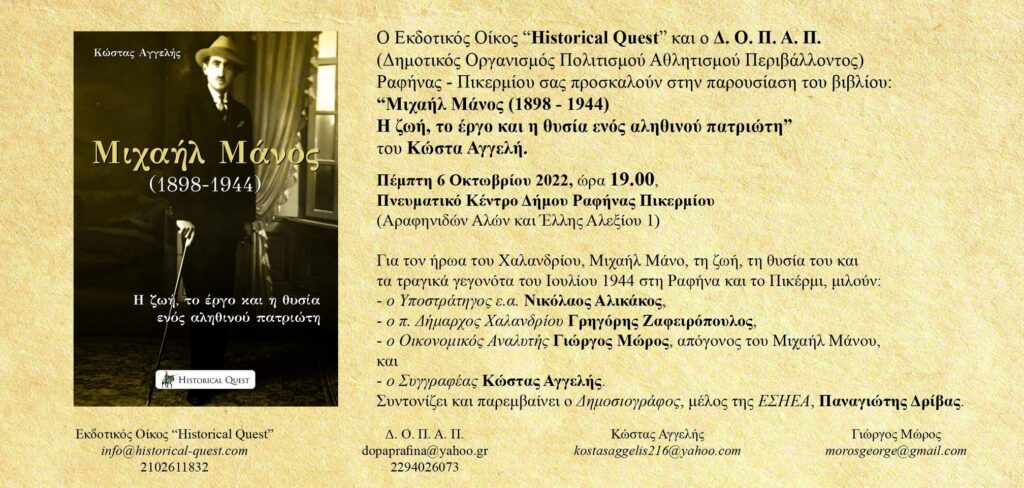 Την Πέμπτη 6 Οκτωβρίου στις 7μμ το Πνευματικό Κέντρο του Δήμου Ραφήνας Πικερμίου φιλοξενεί την παρουσίαση του βιβλίου “Μιχαήλ Μάνος (1898-1944) Η ζωή, το έργο και η θυσία ενός αληθινού πατριώτη”, του Κώστα Αγγελή. Πρόκειται για ένα βιβλίο, προϊόν τετραετούς ενδελεχούς έρευνας, που αφορά τη ζωή του άγνωστου Χαλανδραίου ήρωα, Μιχαήλ Μάνου. Μέσα από τις σελίδες του εκτυλίσσονται ιστορικές στιγμές του πρώτου μισού του 20ου αιώνα, ως τα τραγικά γεγονότα που διαδραματίστηκαν στην Αττική αλλά και ειδικότερα στο Χαλάνδρι τα χρόνια της Γερμανικής κατοχής. Ειδική αναφορά γίνεται για τον απαγχονισμό 54 Ελλήνων στο Πικέρμι από τους Γερμανούς ως αντίποινα για τη δολοφονία 3 Γερμανών στρατιωτικών. Ανάμεσα στους εκτελεσθέντες και ο 46χρονος τότε Χαλανδραίος Μιχαήλ Μάνος.