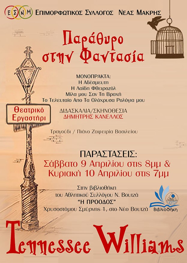 Τέλος το Σαββατοκύριακο το Τμήμα Βιβλιοθήκης του Αθλητικού Συλλόγου Νέου Βουτζά Η ΠΡΟΟΔΟΣ φιλοξενεί δύο θεατρικές παραστάσεις, από τη θεατρική ομάδα του ΕΣΝΜ, σε σκηνοθεσία Δημήτρη Κανέλλου και μουσική επιμέλεια από την εξαιρετική μουσικό Ζαφειρία Βασιλείου, του έργου ‘Παράθυρο στη φαντασία’, που απαρτίζεται από 4 μονόπρακτα του Τένεσσυ Ουίλλιαμς.