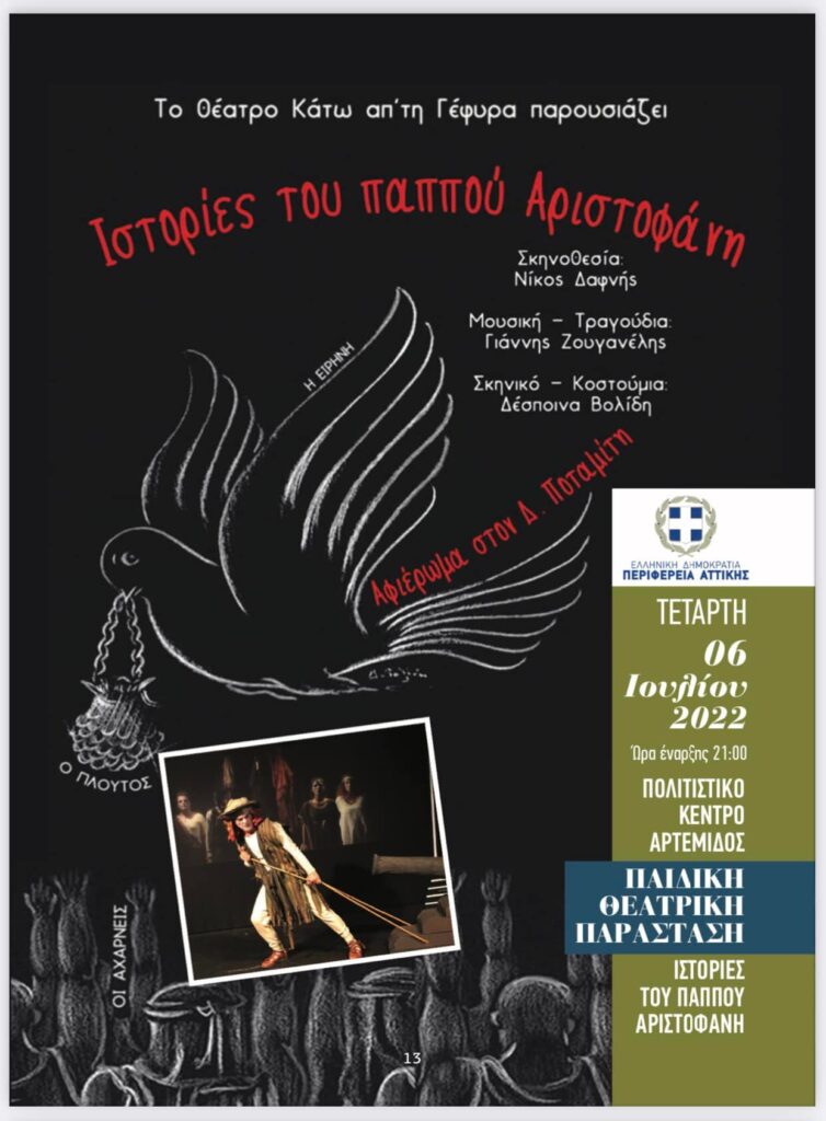 Την Τετάρτη 6 Ιουλίου στις 9μμ, στο Πολιτιστικό Κέντρο Αρτέμιδος, Λεωφ. Αρτέμιδος 137, μπορείτε ν’ απολαύσετε την παιδική θεατρική παράσταση ‘Ιστορίες του παππού Αριστοφάνη‘, σε σκηνοθεσία Χρήστου Δαφνή και μουσική – τραγούδια από τον μοναδικό Γιάννη Ζουγανέλη.