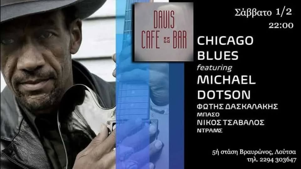 Ο παγκοσμίου φήμης bluesman, κιθαρίστας, συνθέτης και τραγουδιστής από το Σικάγο Michael Dotson σε μια live βραδιά με την καυτή κιθάρα του και διάθεση που θα σας ξεσηκώσει, πλαισιωμένος από τους μουσικούς Φώτη Δασκαλάκη και Νίκο Τσάβαλο.