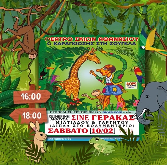 Το Σάββατο στις 4μμ και στις 6μμ (2 παραστάσεις) το Σινέ Γέρακας παρουσιάζει το Θέατρο Σκιών Αθανασίου στην παράσταση ‘Ο Καραγκιόζης στη ζούγκλα’.