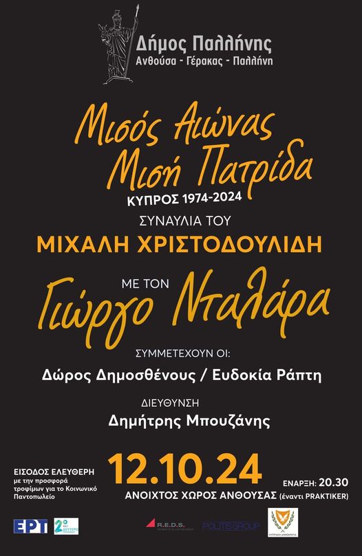 Το Σάββατο το βράδυ, στις 8.30μμ, ο Δήμος Παλλήνης παρουσιάζει τον εξαιρετικό και αγαπημένο όλων καλλιτέχνη Γιώργο Νταλάρα σε μια Συναυλία μνήμης για τη μαύρη επέτειο της Κύπρου «1974 – 2024: Μισός αιώνας – Μισή πατρίδα».