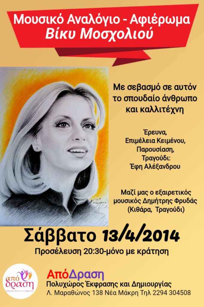 Το Σάββατο στις 8.30μμ ο Πολυχώρος Έκφρασης και Δημιουργίας Απόδραση διοργανώνει ένα Αφιέρωμα στη Βίκυ Μοσχολιού.