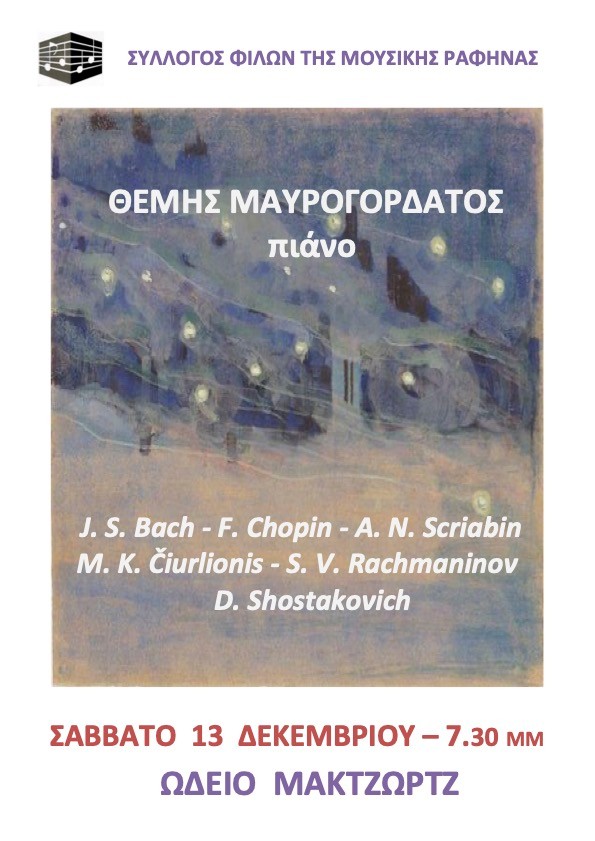 Το Σάββατο το απόγευμα, στις 7.30μμ, το Ωδείο Μακτζώρτζ και ο Σύλλογος Φίλων της Μουσικής Ραφήνας παρουσιάζουν τον πιανίστα Θέμη Μαυρογορδάτο σε έργα Σατί, Ραχμάνινοφ και Γκριγκ.