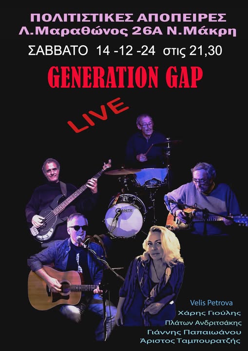 Το γνωστό συγκρότημα Generation Gap αποτελούμενο από τους μουσικούς Πλάτων Ανδριτσάκη στην κιθάρα, Χάρη Γιούλη στο τραγούδι και την ηλεκτρική κιθάρα, Γιώργο Αστρίτη στο τραγούδι και τα πλήκτρα, Άριστο Ταμπουρατζή στα τύμπανα και την εξαιρετική Αντιγόνη στο τραγούδι θα μας ταξιδέψει με το δικό του ξεχωριστό τρόπο σε Blues Rrock ρυθμούς δημιουργώντας μία δυναμική και άκρως ξεσηκωτική καλοκαιρινή βραδιά.