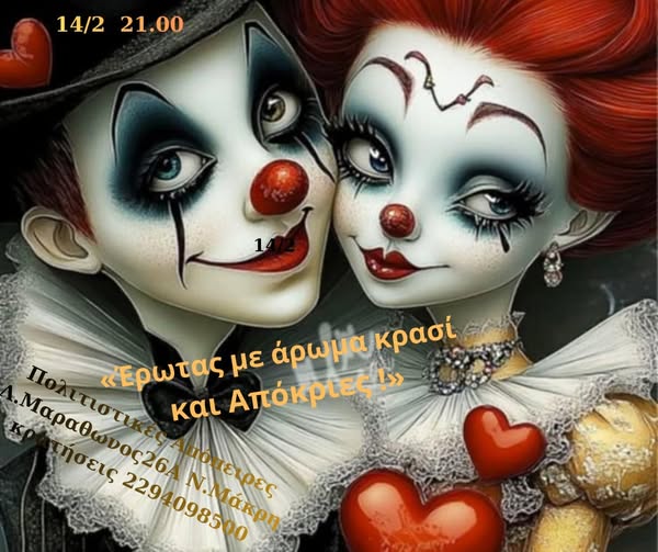 Και όχι μόνο… καθώς η βραδιά θα έχει καλό φαγητό, κρασί ή ποτό με καλή παρέα, σε ζεστή ατμόσφαιρα, σε μια υπέροχη αποκριάτικη βραδιά!