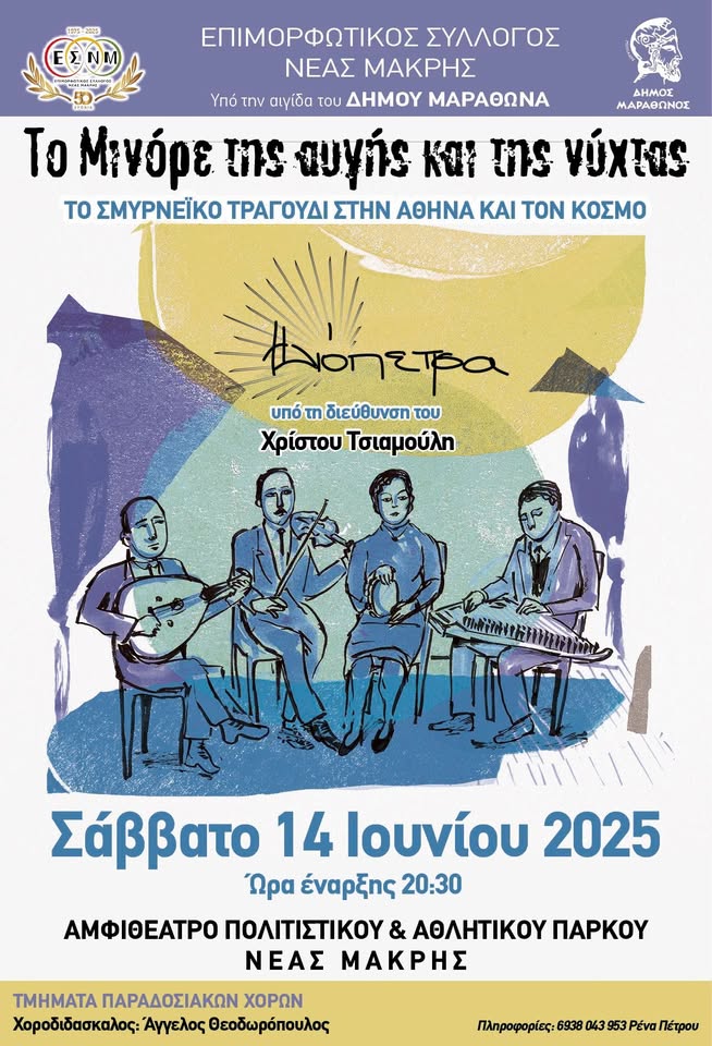 Το Σάββατο το βράδυ, στις 8.30μμ, ο Επιμορφωτικός Σύλλογος Νέας Μάκρης, υπό τη αιγίδα του δήμου Μαραθώνος, παρουσιάζουν την καλοκαιρινή συναυλία ‘Το Μινόρε της Αυγής και της Νύχτας’ της χορωδίας του ΕΣΝΜ ‘Ηλιόπετρα’, με διευθυντή και μαέστρο τον κύριο Χρίστο Τσιαμούλη.
