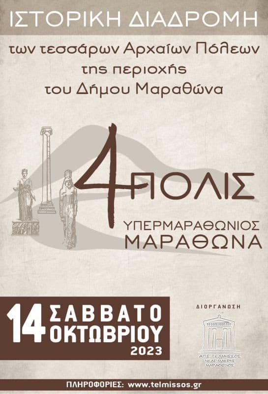 Το Σάββατο στις 6πμ ο Αθλητικός Σύλλογος Μαραθωνοδρόμων ΤΕΛΜΗΣΣΟΣ διοργανώνει για τρίτη συνεχή χρονιά τον 4ΠΟΛΙΣ Υπερμαραθώνιο Μαραθώνα, τιμώντας την ιστορία του Δήμου Μαραθώνα.