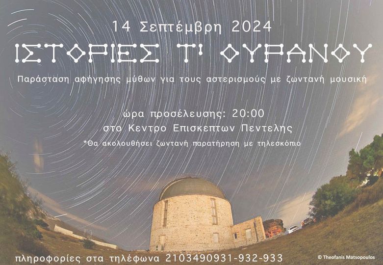 Το Σάββατο το βράδυ, στις 8μμ, το Κέντρο Επισκεπτών Πεντέλης διοργανώνει μια βραδιά αφήγησης μύθων, μουσικής και αστροπαρατήρησης στον προαύλιο χώρο του