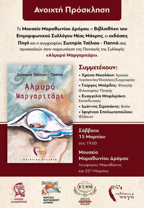 Το Σάββατο, το απόγευμα, στις 7μμ, το Μουσείο Μαραθωνίου Δρόμου και η Βιβλιοθήκη του Επιμορφωτικού Συλλόγου Νέας Μάκρης διοργανώνουν την παρουσίαση της ποιητικής συλλογής ‘Αλμυρό Μαργαριτάρι’, της εκπαιδευτικού και συγγραφέως Σωτηρίας Τσέλιου – Παππά, που κυκλοφορεί από τις εκδόσεις Πηγή.