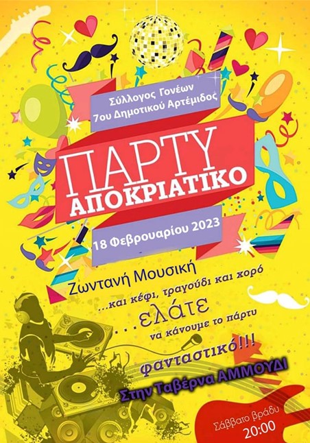 Το Σάββατο στις 8μμ ο Σύλλογος Γονέων του 7ου Δημοτικού Σχολείου Αρτέμιδας διοργανώνει ένα μεγάλο αποκριάτικο πάρτι και προσκαλεί γονείς και παιδιά, σε μια βραδιά γεμάτη κέφι, χαρά, διασκέδαση και χορό, με ζωντανή μουσική, καλό φαγητό, πλούσια δώρα και πολλές εκπλήξεις!!