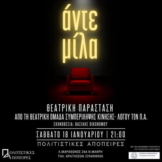 Η θεατρική ομάδα Συμπερίληψης, Κίνησης-Λόγου του πολιτιστικού συλλόγου Πολιτιστικές Απόπειρες ανεβάζει πέντε σπουδαία θεατρικά έργα, που συναντώνται σε μία σπονδυλωτή θεατρική παράσταση με κοινό αίτημα ‘Άντε Μίλα’.