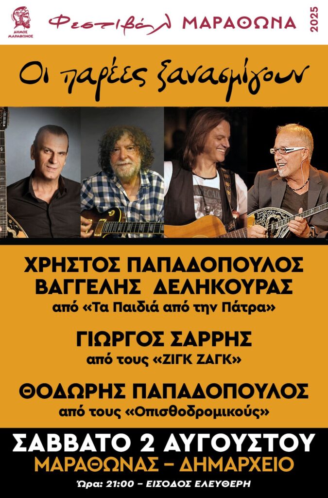 Το Σάββατο το βράδυ, στις 9μμ, ο Δήμος Μαραθώνα, στα πλαίσια του ‘Φεστιβάλ Μαραθώνα, παρουσιάζει τη μουσική βραδιά ‘Οι παρέες ξανασμίγουν’.
