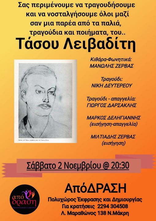 Το Σάββατο το βράδυ, στις 8.30μμ, ο Πολυχώρος Έκφρασης και Δημιουργίας ΑπόΔραση διοργανώνει ένα Μουσικό Αφιέρωμα στον Ποιητή Τάσο Λειβαδίτη.