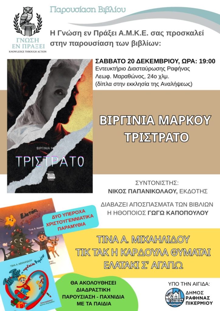 Το Σάββατο το απόγευμα, στις 7μμ, η Γνώση εν Πράξει Α.Μ.Κ.Ε. διοργανώνει την Παρουσίαση του Βιβλίου ‘Τρίστρατο’ της Βιργινίας Μάρκου.