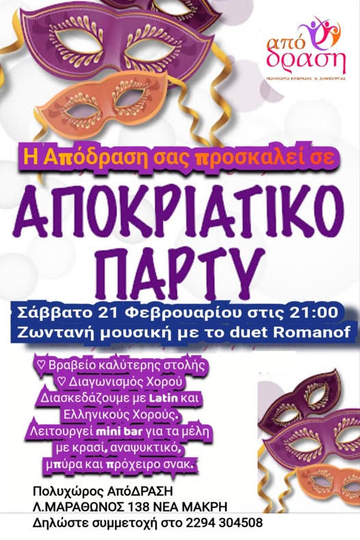 Το Σάββατο το βράδυ, στις 8.30μμ, ο Πολυχώρος Έκφρασης και Δημιουργίας ΑπόΔΡΑΣΗ διοργανώνει το πιο ξεσηκωτικό Μασκέ Πάρτι Ενηλίκων.