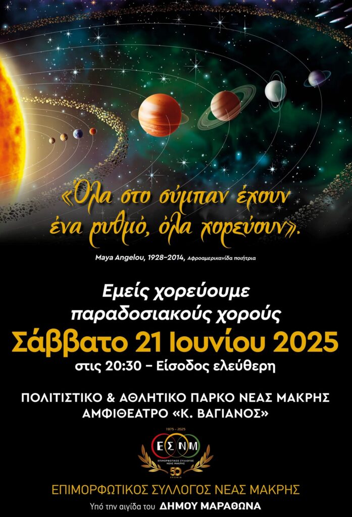 Το Σάββατο το βράδυ, στις 9μμ, ο Πολιτιστικός Σύλλογος Νέας Μάκρης διοργανώνει τη Μουσικοχορευτική Παράσταση ‘Όλα στο σύμπαν έχουν ένα ρυθμό, όλα χορεύουν’.