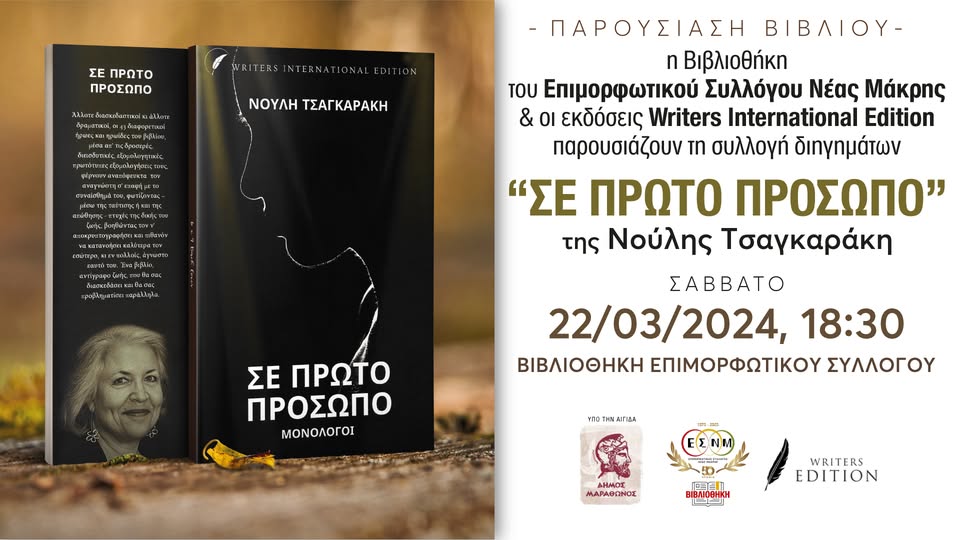 Το Σάββατο το απόγευμα, στις 6.30μμ, η Βιβλιοθήκη του Επιμορφωτικού Συλλόγου Νέας Μάκρης και οι εκδόσεις Writers International Edition διοργανώνουν την παρουσίαση της συλλογής διηγημάτων ‘Σε πρώτο πρόσωπο’, της συγγραφέως και ποιήτριας Νούλης Τσαγκαράκηστο, στο χώρο της βιβλιοθήκης του Επιμορφωτικού Συλλόγου.