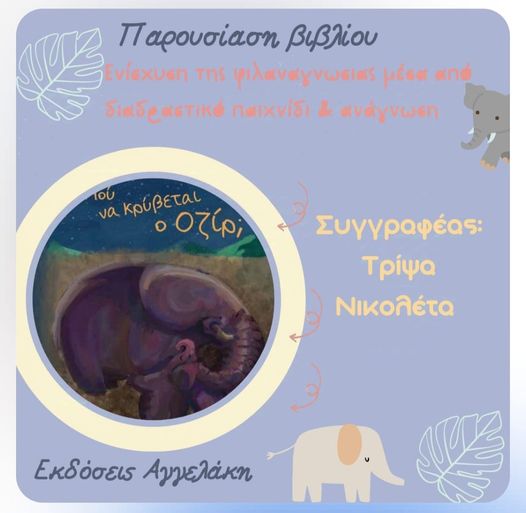 Την Παρασκευή το απόγευμα, στις 6μμ, το εργαστήρι Παραμυθογνωσίας θα φιλοξενήσει στο ΚΔΑΠ Αγίας Μαρίνας την Παρουσίαση του Βιβλίου ‘Πού να κρύβεται ο Οζίρ;’ της Νικολέτας Τρίψα Μανουσιδάκη, από τις εκδόσεις Αγγελάκη.