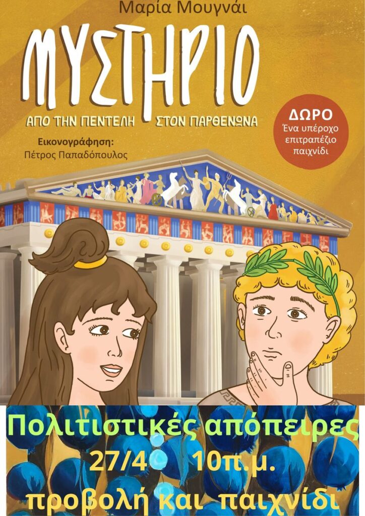 Το πρόγραμμα, που στηρίζεται στο ομώνυμο βιβλίο της αρχαιολόγου Μαρίας Μουγνάι, μεταφέρει νοερά τα παιδιά στην αρχαία Αθήνα και την Ακρόπολη και παρέα με τους ήρωες της ιστορίας θα ανακαλύψουν τον Παρθενώνα και τα λατομεία της Πεντέλης.