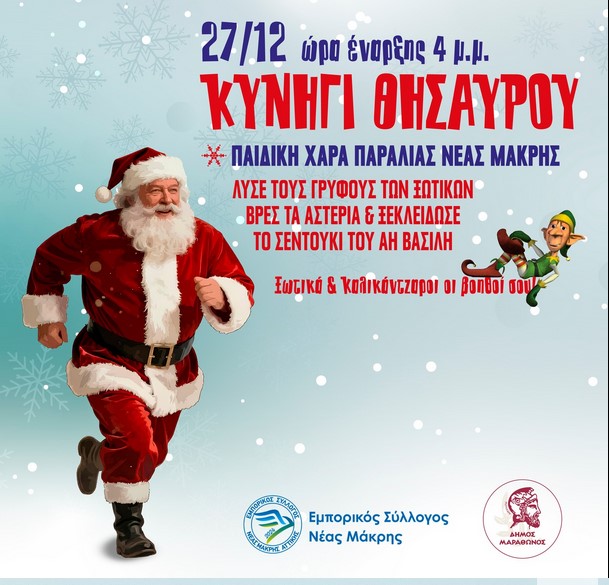 Το Σάββατο το απόγευμα, στις 4μμ, ο Δήμος Μαραθώνος διοργανώνει το πιο διασκεδαστικό Χριστουγεννιάτικο Κυνήγι Θησαυρού, στην παιδική χαρά της παραλίας Νέας Μάκρης.