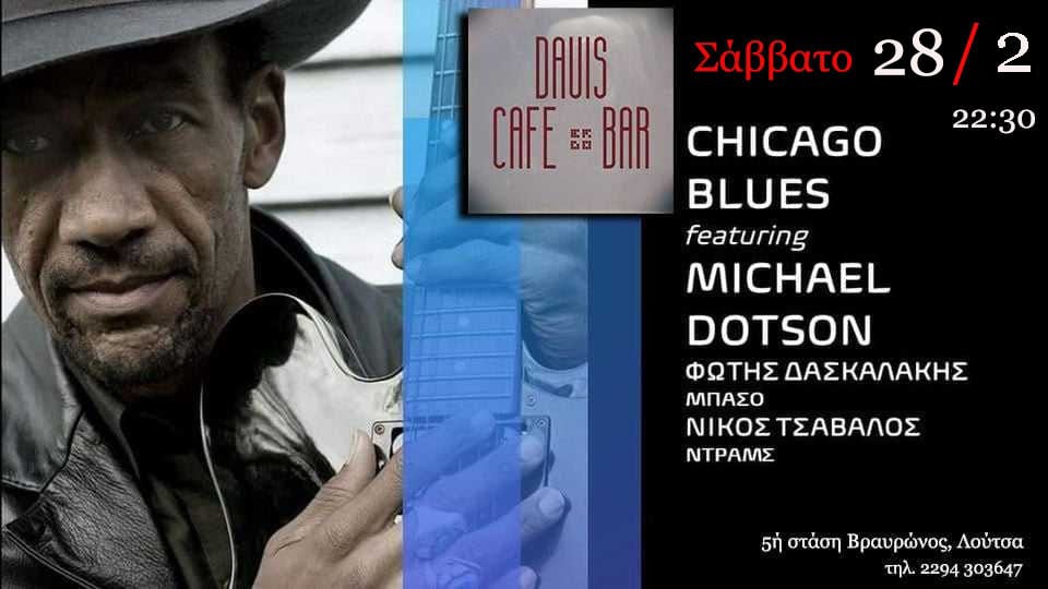 Ο παγκοσμίου φήμης bluesman, κιθαρίστας, συνθέτης και τραγουδιστής από το Σικάγο Michael Dotson σε μια live βραδιά με την καυτή κιθάρα του και διάθεση που θα σας ξεσηκώσει, πλαισιωμένος από τους μουσικούς Φώτη Δασκαλάκη και Νίκο Τσάβαλο.
