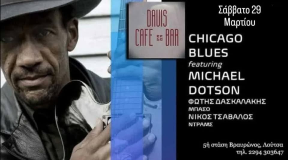 Ο παγκοσμίου φήμης bluesman, κιθαρίστας, συνθέτης και τραγουδιστής από το Σικάγο Michael Dotson σε μια live βραδιά με την καυτή κιθάρα του και διάθεση που θα σας ξεσηκώσει, πλαισιωμένος από τους μουσικούς Φώτη Δασκαλάκη και Νίκο Τσάβαλο.