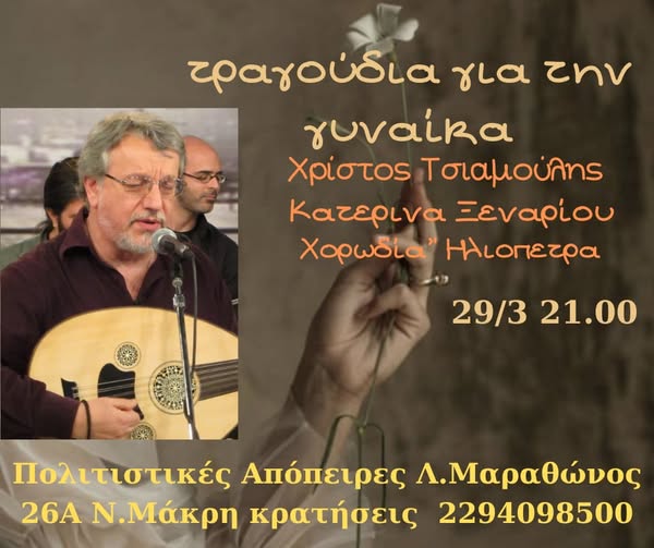 Ο Χρίστος Τσιαμούλης, μαζί με την Κατερίνα Ξεναρίου και τη χορωδία του ΕΣΝΜ ‘Ηλιόπετρα’ θα μας ταξιδέψουν με τραγούδια για ερωτικές γνωριμίες, γάμους, υποσχέσεις, χωρισμούς και ξενύχτια κάτω από παράθυρα, αλλά και για ψεύτρες και μπαμπέσες, χανούμισες και φελάχες, ξανθιές και μελαχρινές…
