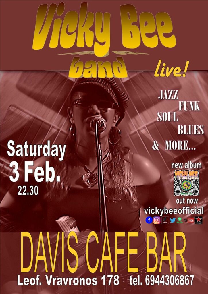 Την Σάββατο στις 10.30μμ το Davis Café Bar στη Λούτσα διοργανώνει μία όμορφη μουσική βραδιά με την Vicky Bee σ’ ένα εκλεκτικό μείγμα μουσικής.