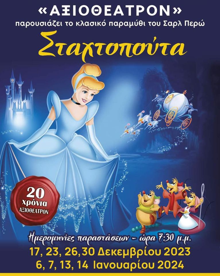 Το Σάββατο και την Κυριακή στις 7.30μμ η θεατρική ομάδα ενηλίκων του συλλόγου Αξιοθέατρον παρουσιάζει το κλασσικό παραμύθι ‘Η Σταχτοπούτα’ του Σαρλ Περώ.
