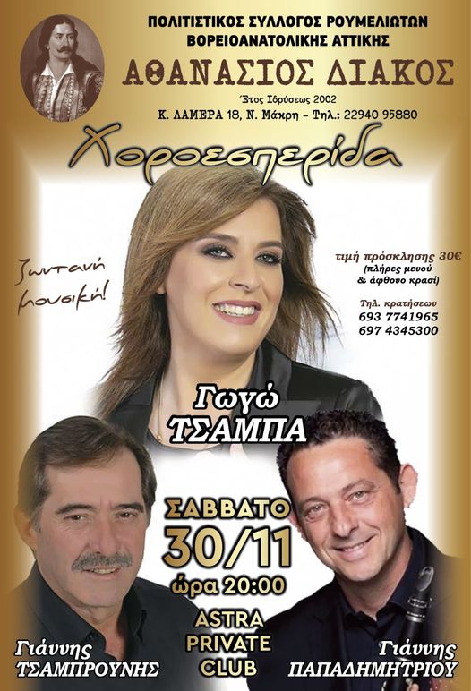 Το Σάββατο το βράδυ, στις 8μμ, ο Πολιτιστικός Σύλλογος Ρουμελιωτών Βορειοανατολικής Αττικής διοργανώνει μια μουσική χοροεσπερίδα με τη Γωγώ Τσαμπά.