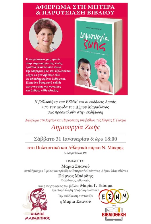 Το Σάββατο το απόγευμα, στις 6μμ, η Βιβλιοθήκη του Επιμορφωτικού Συλλόγου Νέας Μάκρης και οι εκδόσεις Αρμός διοργανώνουν την παρουσίαση του βιβλίου τίτλο ‘Δημιουργία ζωής’ της Μαρίας Γκόσμα.