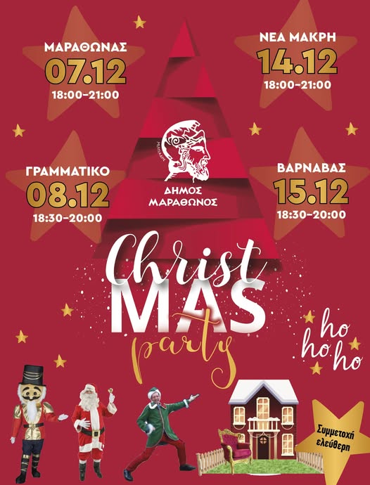 O Δήμος Μαραθώνος μπαίνει σε εορταστικό πνεύμα και διοργανώνει, σε συνεργασία με τις Κοινότητες Μαραθώνα και Βαρνάβα, τέσσερις μεγάλες Χριστουγεννιάτικες Γιορτές, στις 4 Κοινότητες του Δήμου.