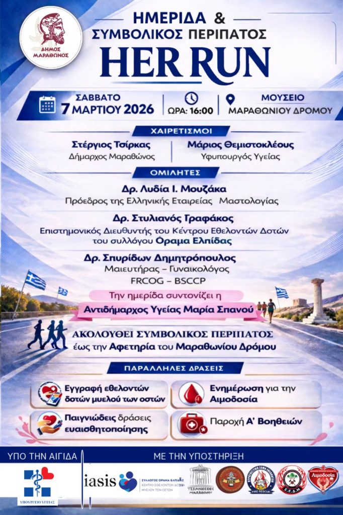 Μετά την ημερίδα, ενώνουμε τα βήματά μας στον συμβολικό περίπατο “Her Run” μέχρι την Αφετηρία του Μαραθωνίου Δρόμου, στέλνοντας μήνυμα ισότητας, ενότητας και συλλογικής δύναμης.