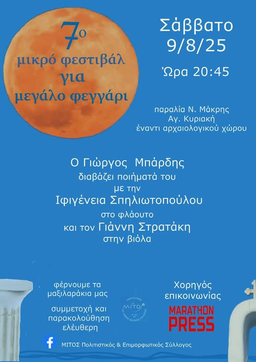 Το Σάββατο το βράδυ, την ώρα που ανατέλλει η πανσέληνος, στις 8.45μμ, ο Πολιτιστικός και Επιμορφωτικός Σύλλογος ΜΙΤΟΣ, στα πλαίσια του 7ου Μικρού Φεστιβάλ για το Μεγάλο Φεγγάρι, διοργανώνει μια Ποιητική Βραδιά με την ποίηση του Γιώργου Μπάρδη, στην Παραλία της Νέας Μάκρης.