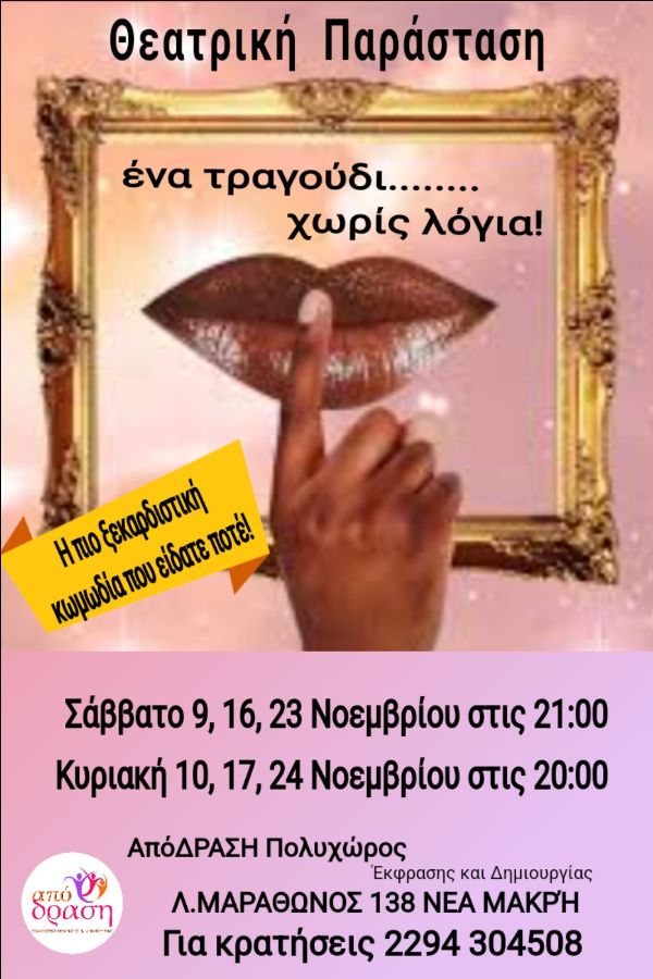 Το Σαββατοκύριακο το βράδυ ο Πολυχώρος Έκφρασης και Δημιουργίας ΑπόΔραση παρουσιάζει τη Θεατρική Παράσταση ‘Ένα τραγούδι….. χωρίς λόγια!’.