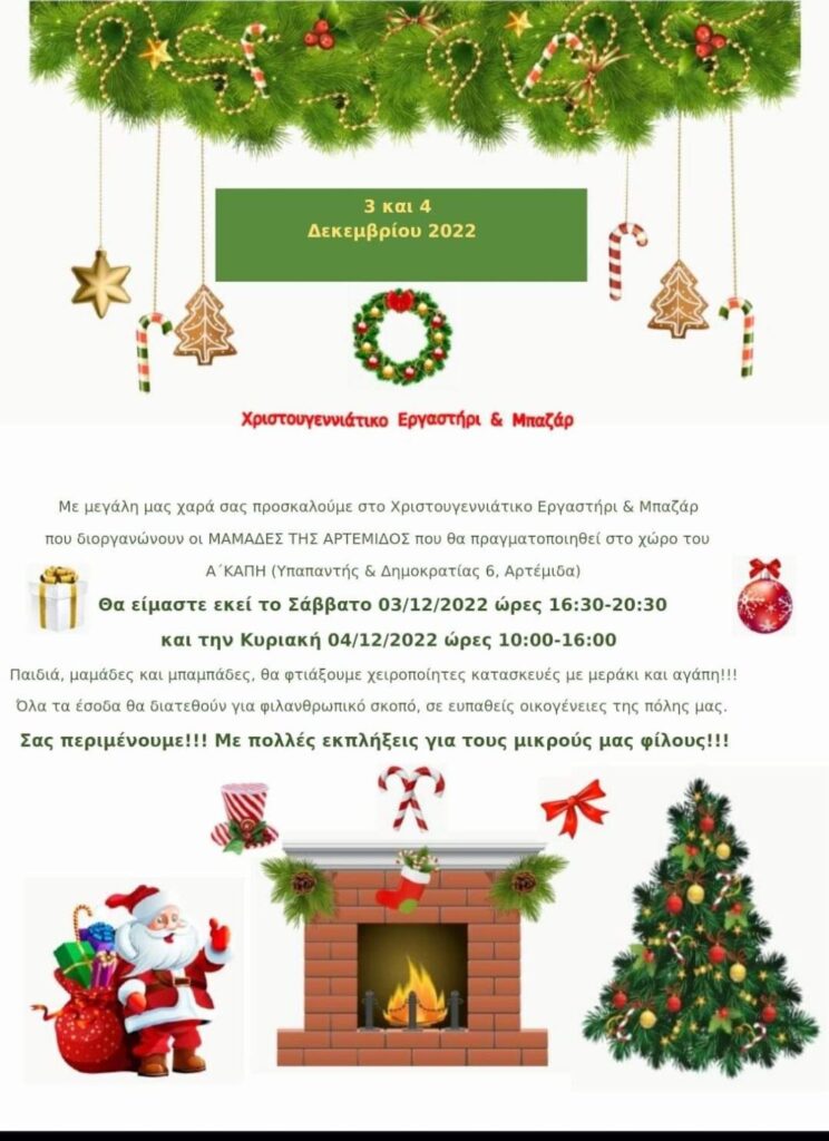Το Σαββατοκύριακο στις 3 και 4 Δεκεμβρίου οι Μαμάδες της Αρτέμιδος διοργανώνουν Χριστουγεννιάτικο Εργαστήρι και Μπαζάρ στο χώρο του Α’ Καπή Αρτέμιδας.