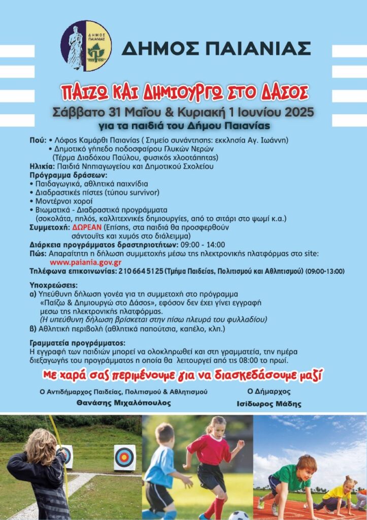Συγκεκριμένα, το Σάββατο 31 Μαΐου ο Λόφος Καμάρθι στην Παιανία και την Κυριακή 1 Ιουνίου το Δημοτικό γήπεδο ποδοσφαίρου Γλυκών Νερών, μετατρέπονται σε τόπους συνάντησης, εκπαίδευσης και ψυχαγωγίας για όλα τα παιδιά του δήμου από τις 09πμ έως τις 2μμ.