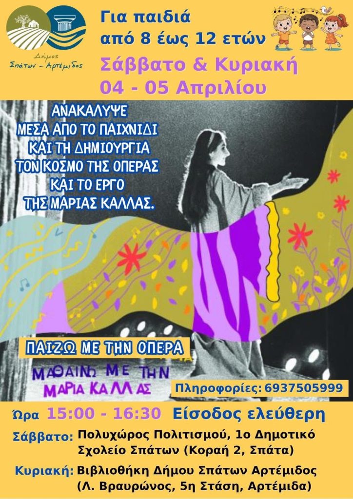 Το Σαββατοκύριακο το μεσημέρι, στις 3μμ, το τμήμα Πολιτισμού του Δήμου Σπάτων – Αρτέμιδος διοργανώνει τη διαδραστική εμπειρία ‘Παίζω με την Όπερα, Μαθαίνω με την Κάλλας’.