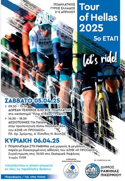 Την Κυριακή 6 Απριλίου θα διεξαχθεί το 5ο ΕΤΑΠ του Ποδηλατικού Γύρου Ελλάδας ΔΕΗ Tour of Hellas, που θα διασχίσει και το Δήμο Ραφήνας. Η Διεύθυνση Αθλητισμού του Δήμου σε συνεργασία με τον Αθλητικό Σύλλογο Νέου Βουτζά «Η ΠΡΟΟΔΟΣ», θα πραγματοποιήσουν παράλληλες δράσεις για μικρούς και μεγάλους, σε ένα Σαββατοκύριακο αφιερωμένο στην ποδηλασία!