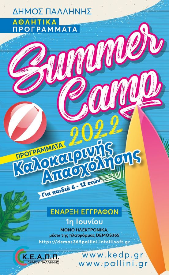 Στο Δήμο Παλλήνης θα πραγματοποιηθούν τρία διαφορετικά προγράμματα για παιδιά από 6 έως 12 ετών, που στοχεύουν στην ποιοτική αξιοποίηση του ελεύθερου χρόνου των παιδιών μετά από τη λήξη του σχολικού έτους, δίνοντας τους την ευκαιρία να έρθουν σε επαφή με μια ευρεία γκάμα αθλημάτων, ν’ ανακαλύψουν τα ταλέντα τους, ν’ αναπτύξουν τεχνικές δεξιότητες και να βελτιώσουν τη φυσική τους κατάσταση! Για πληροφορίες εδώ