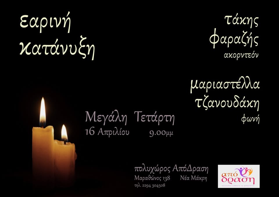 Την Μεγάλη Τετάρτη το βράδυ, στις 9μμ, ο Πολυχώρος Έκφρασης και Δημιουργίας ΑπόΔΡΑΣΗ διοργανώνει την Πασχαλινή συναυλία ‘Εαρινή Κατάνυξη’.