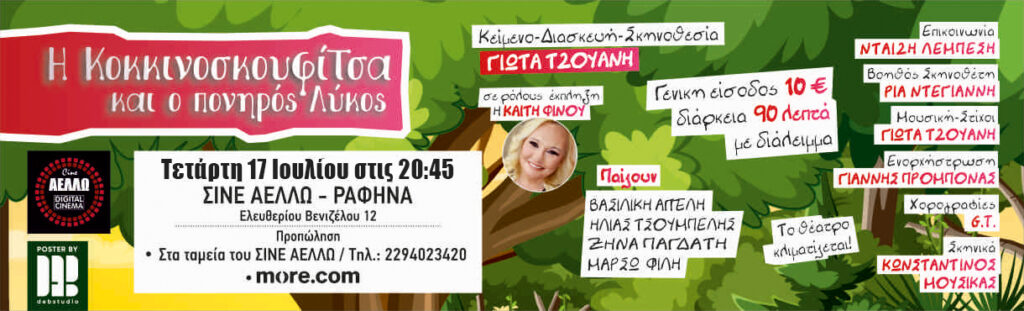 Την Τετάρτη το βράδυ στις 8.45μμ το Σινέ Αελλώ στην Ραφήνα παρουσιάζει τη ‘Νέα Αυλαία ΑΜΚΕ’ στη Θεατρική Παράσταση ‘Η Κοκκινοσκουφίτσα και ο Πονηρός Λύκος’ του Σαρλ Περώ.