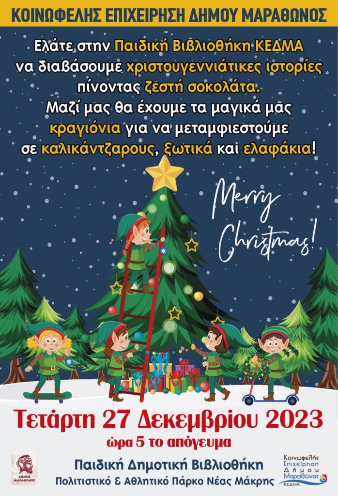Την Τετάρτη στις 5μμ ο Δήμος Μαραθώνος διοργανώνει μια όμορφη Χριστουγεννιάτικη εκδήλωση στην Παιδική Δημοτική Βιβλιοθήκη της ΚΕΔΜΑ στο Πολιτιστικό και Αθλητικό Πάρκο Νέας Μάκρης.