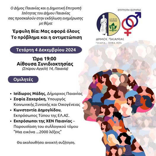 Μια εκδήλωση, στο πλαίσιο της Διεθνούς ημέρας εξάλειψης της βίας κατά των γυναικών, που φιλοξενείται στην Αίθουσα Συνιδιοκτησίας Παιανίας, όπου ο Δήμαρχος Παιανίας Ισίδωρος Μάδης, η Υπουργός Κοινωνικής Συνοχής και Οικογένειας Σοφία Ζαχαράκη, η εκπρόσωπος τύπου της ΕΛΑΣ Κωνσταντία Δημογλίδου και εκπρόσωποι της ΧΕΝ Παιανίας θα μιλήσουν για το φαινόμενο που αποκτά θηριώδεις διαστάσεις στη χώρα μας.