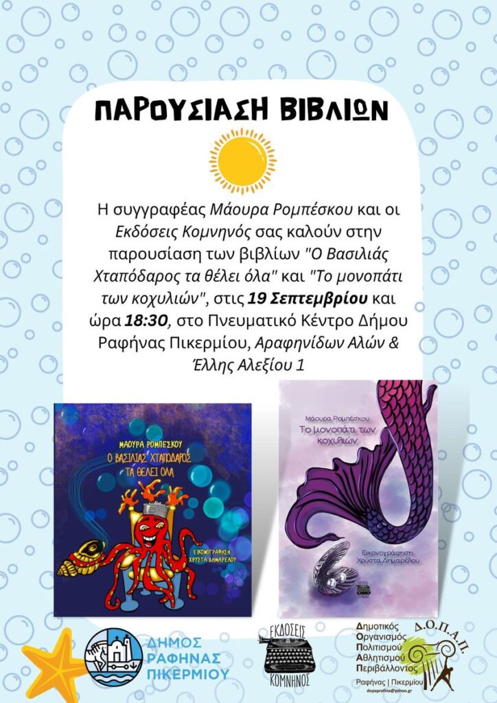 Την Τρίτη στις 6.30μμ ο Δήμος Ραφήνας-Πικερμίου και οι εκδόσεις Κομνηνός σας προσκαλούν στην αίθουσα του Πνευματικού Κέντρου Ραφήνας για την παρουσίαση δυο παιδικών βιβλίων της Μάουρα Ρομπέσκου.