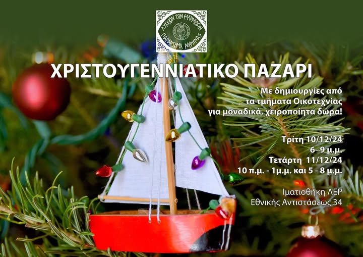 Μέσα στο γιορτινό κλίμα των Χριστουγέννων τα τμήματα Οικοτεχνίας του Λυκείου Ελληνίδων Ραφήνας διοργανώνουν “Χριστουγεννιάτικο παζάρι” με μοναδικές χειροποίητες δημιουργίες, ξεχωριστά δώρα για όλους τους αγαπημένους μας!