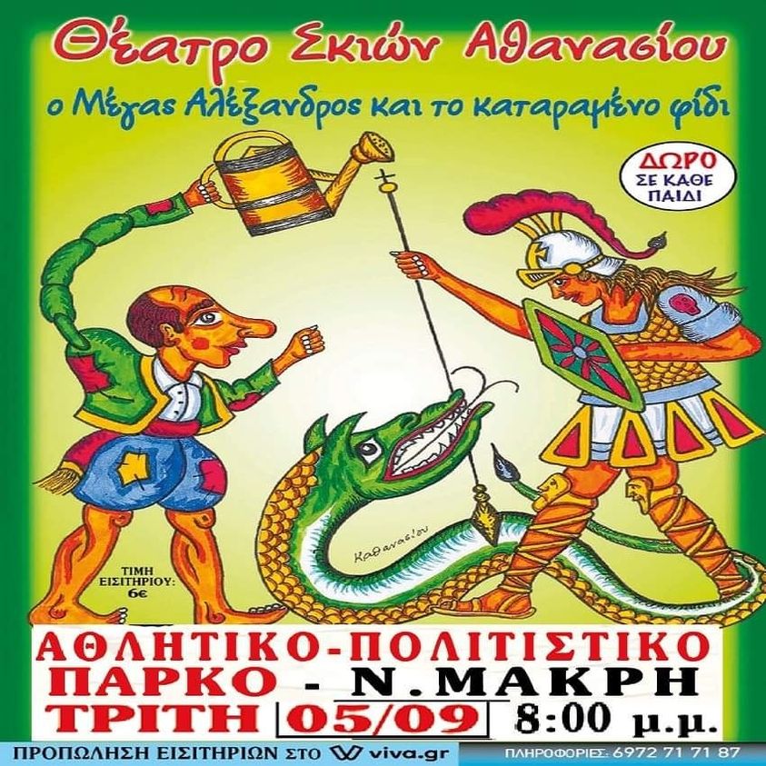 Την Τρίτη στις 8μμ το Πολιτιστικό και Αθλητικό Κέντρο Νέας Μάκρης παρουσιάζει το Θέατρο Σκιών Αθανασίου στην παράσταση “Ο Μέγας Αλέξανδρος και το καταραμένο φίδι”.